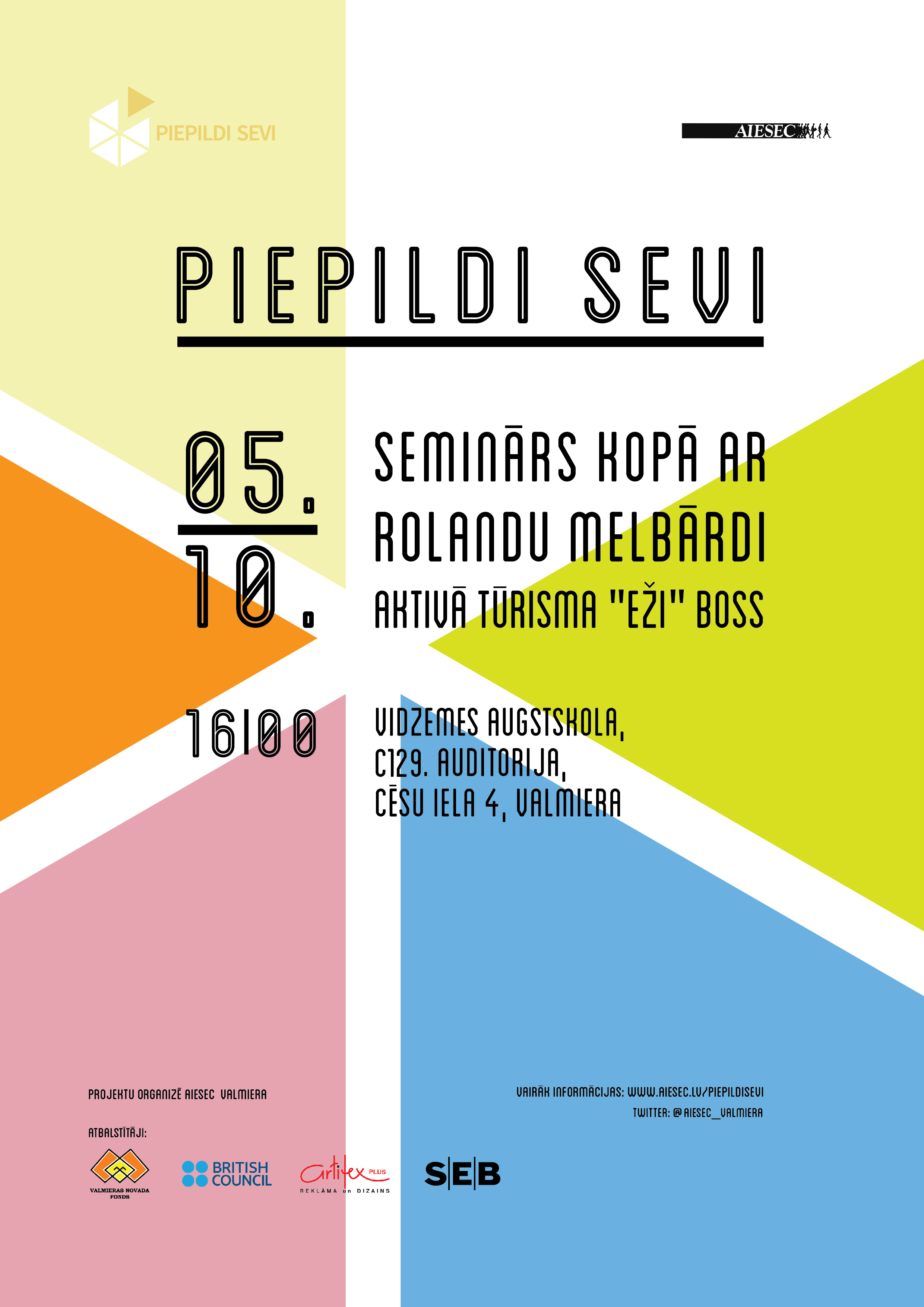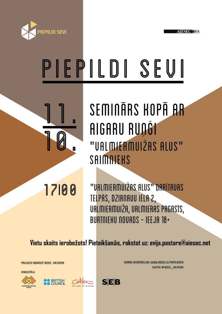 AIESEC Valmiera projekta „Piepildi sevi” ietvaros notikuši nu jau trīs semināri-darbnīcas, kuru laikā jaunieši smēlušies iedvesmu no sava darba entuziastiem – fotomākslinieka Jāņa Vīksnas, „Aktīvā tūrisma centra „Eži”” vadītāja Rolanda Melbārža un „Valmiermuižas alus” brūža saimnieka Aigara Ruņģa.